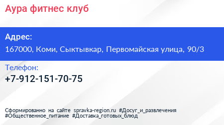 Аура, фитнес-клуб по адресу 167000, Коми, Сыктывкар, Первомайская улица, 90/3 в дальнейшем Организация, размещена в следующих категориях: