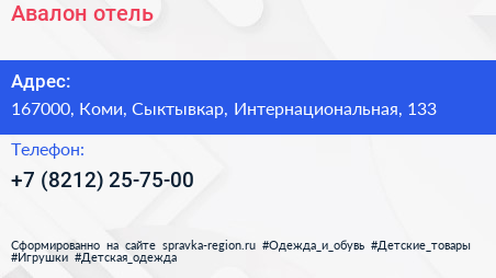 Авалон, отель по адресу 167000, Коми, Сыктывкар, Интернациональная, 133 в дальнейшем Организация, размещена в следующих категориях: