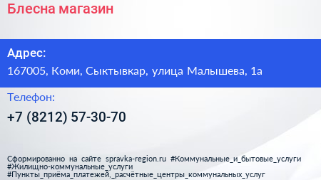 Блесна, магазин по адресу 167005, Коми, Сыктывкар, улица Малышева, 1а в дальнейшем Организация, размещена в следующих категориях: