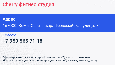 Cherry, фитнес-студия по адресу 167000, Коми, Сыктывкар, Первомайская улица, 72 в дальнейшем Организация, размещена в следующих категориях: