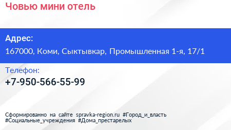 Човью, мини-отель по адресу 167000, Коми, Сыктывкар, Промышленная 1-я, 17/1 в дальнейшем Организация, размещена в следующих категориях: