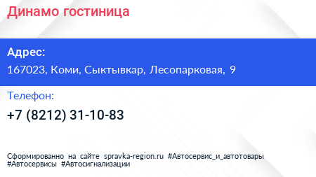 Динамо, гостиница по адресу 167023, Коми, Сыктывкар, Лесопарковая, 9 в дальнейшем Организация, размещена в следующих категориях: