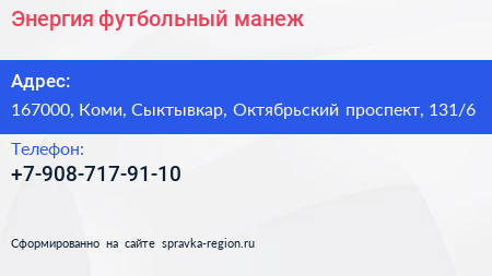 Энергия, футбольный манеж по адресу 167000, Коми, Сыктывкар, Октябрьский проспект, 131/6 в дальнейшем Организация, размещена в следующих категориях: