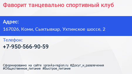 Фаворит, танцевально-спортивный клуб по адресу 167026, Коми, Сыктывкар, Ухтинское шоссе, 2 в дальнейшем Организация, размещена в следующих категориях: