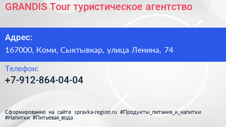 GRANDIS Tour, туристическое агентство по адресу 167000, Коми, Сыктывкар, улица Ленина, 74 в дальнейшем Организация, размещена в следующих категориях: