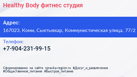 Healthy Body, фитнес-студия по адресу 167023, Коми, Сыктывкар, Коммунистическая улица, 77/2 в дальнейшем Организация, размещена в следующих категориях: