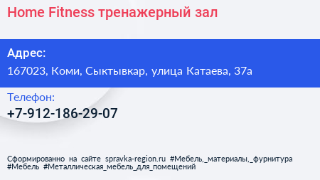 Home Fitness, тренажерный зал по адресу 167023, Коми, Сыктывкар, улица Катаева, 37а в дальнейшем Организация, размещена в следующих категориях: