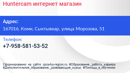 Huntercam, интернет-магазин по адресу 167016, Коми, Сыктывкар, улица Морозова, 51 в дальнейшем Организация, размещена в следующих категориях: