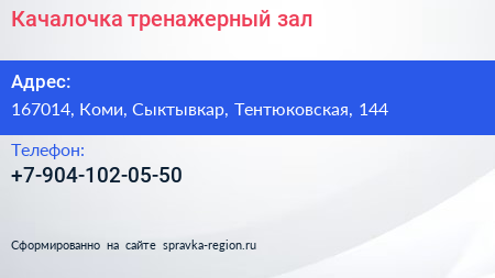 Качалочка, тренажерный зал по адресу 167014, Коми, Сыктывкар, Тентюковская, 144 в дальнейшем Организация, размещена в следующих категориях: