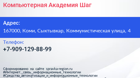 Компьютерная Академия Шаг по адресу 167000, Коми, Сыктывкар, Коммунистическая улица, 4 в дальнейшем Организация, размещена в следующих категориях: