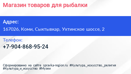 Магазин товаров для рыбалки по адресу 167026, Коми, Сыктывкар, Ухтинское шоссе, 2 в дальнейшем Организация, размещена в следующих категориях: