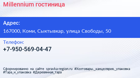 Millennium, гостиница по адресу 167000, Коми, Сыктывкар, улица Свободы, 50 в дальнейшем Организация, размещена в следующих категориях: