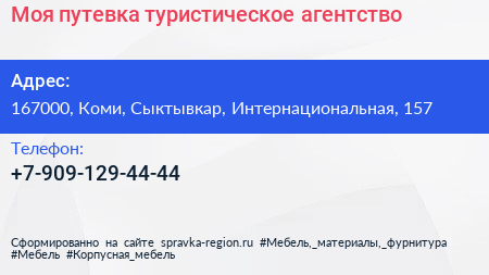 Моя путевка, туристическое агентство по адресу 167000, Коми, Сыктывкар, Интернациональная, 157 в дальнейшем Организация, размещена в следующих категориях: