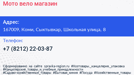 Мото-вело, магазин по адресу 167009, Коми, Сыктывкар, Школьная улица, 8 в дальнейшем Организация, размещена в следующих категориях: