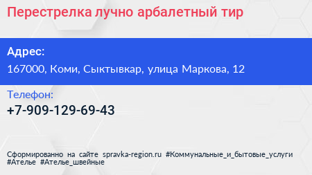 Перестрелка, лучно-арбалетный тир по адресу 167000, Коми, Сыктывкар, улица Маркова, 12 в дальнейшем Организация, размещена в следующих категориях: