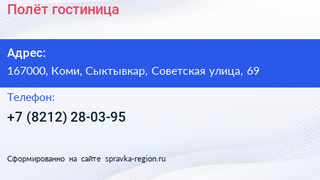 Полёт, гостиница по адресу 167000, Коми, Сыктывкар, Советская улица, 69 в дальнейшем Организация, размещена в следующих категориях: