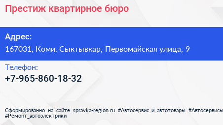 Престиж, квартирное бюро по адресу 167031, Коми, Сыктывкар, Первомайская улица, 9 в дальнейшем Организация, размещена в следующих категориях: