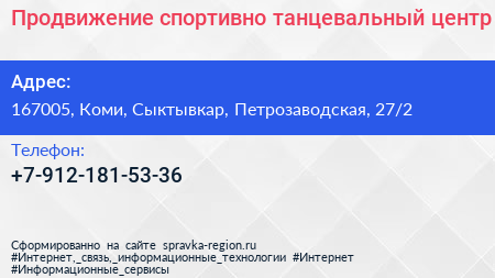 Продвижение, спортивно-танцевальный центр по адресу 167005, Коми, Сыктывкар, Петрозаводская, 27/2 в дальнейшем Организация, размещена в следующих категориях: