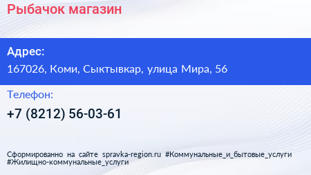 Рыбачок, магазин по адресу 167026, Коми, Сыктывкар, улица Мира, 56 в дальнейшем Организация, размещена в следующих категориях: