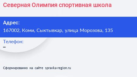 Северная Олимпия, спортивная школа по адресу 167002, Коми, Сыктывкар, улица Морозова, 135 в дальнейшем Организация, размещена в следующих категориях: