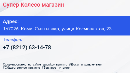 Супер-Колесо, магазин по адресу 167026, Коми, Сыктывкар, улица Космонавтов, 23 в дальнейшем Организация, размещена в следующих категориях: