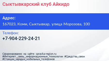 Сыктывкарский клуб Айкидо по адресу 167023, Коми, Сыктывкар, улица Морозова, 100 в дальнейшем Организация, размещена в следующих категориях: