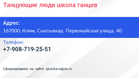 Танцующие люди, школа танцев по адресу 167000, Коми, Сыктывкар, Первомайская улица, 40 в дальнейшем Организация, размещена в следующих категориях: