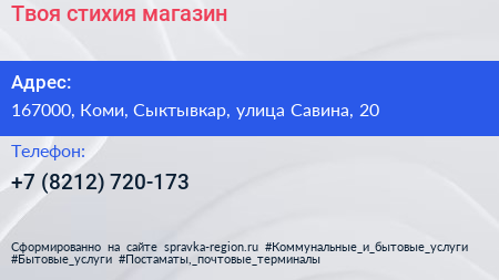 Твоя стихия, магазин по адресу 167000, Коми, Сыктывкар, улица Савина, 20 в дальнейшем Организация, размещена в следующих категориях: