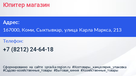 Юпитер, магазин по адресу 167000, Коми, Сыктывкар, улица Карла Маркса, 213 в дальнейшем Организация, размещена в следующих категориях: