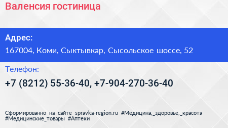 Валенсия, гостиница по адресу 167004, Коми, Сыктывкар, Сысольское шоссе, 52 в дальнейшем Организация, размещена в следующих категориях: