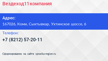 Вездеход11, компания по адресу 167026, Коми, Сыктывкар, Ухтинское шоссе, 6 в дальнейшем Организация, размещена в следующих категориях: