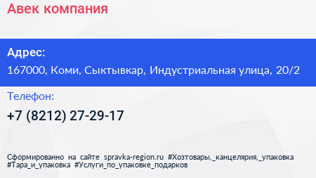 Авек, компания по адресу 167000, Коми, Сыктывкар, Индустриальная улица, 20/2 в дальнейшем Организация, размещена в следующих категориях:
