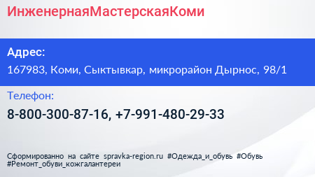 ИнженернаяМастерскаяКоми по адресу 167983, Коми, Сыктывкар, микрорайон Дырнос, 98/1 в дальнейшем Организация, размещена в следующих категориях: