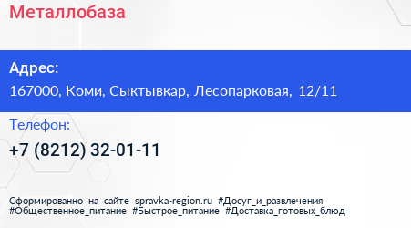 Металлобаза по адресу 167000, Коми, Сыктывкар, Лесопарковая, 12/11 в дальнейшем Организация, размещена в следующих категориях: