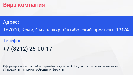 Вира, компания по адресу 167000, Коми, Сыктывкар, Октябрьский проспект, 131/4 в дальнейшем Организация, размещена в следующих категориях:
