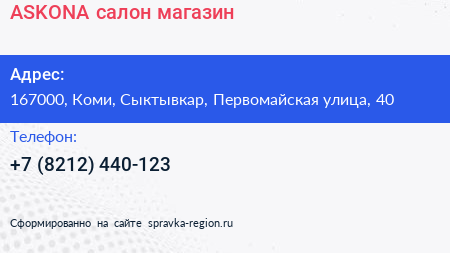 ASKONA, салон-магазин по адресу 167000, Коми, Сыктывкар, Первомайская улица, 40 в дальнейшем Организация, размещена в следующих категориях: