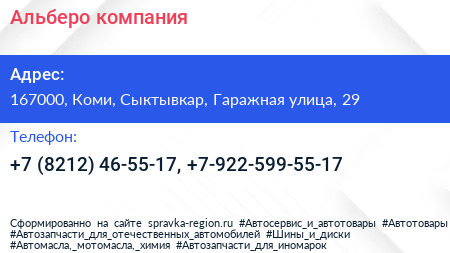 Альберо, компания по адресу 167000, Коми, Сыктывкар, Гаражная улица, 29 в дальнейшем Организация, размещена в следующих категориях: