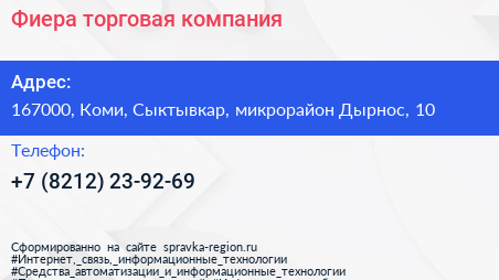Фиера, торговая компания по адресу 167000, Коми, Сыктывкар, микрорайон Дырнос, 10 в дальнейшем Организация, размещена в следующих категориях: