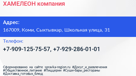 ХАМЕЛЕОН, компания по адресу 167009, Коми, Сыктывкар, Школьная улица, 31 в дальнейшем Организация, размещена в следующих категориях: