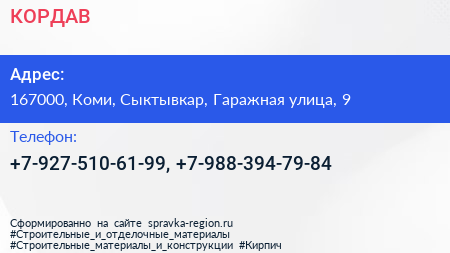 КОРДАВ по адресу 167000, Коми, Сыктывкар, Гаражная улица, 9 в дальнейшем Организация, размещена в следующих категориях: