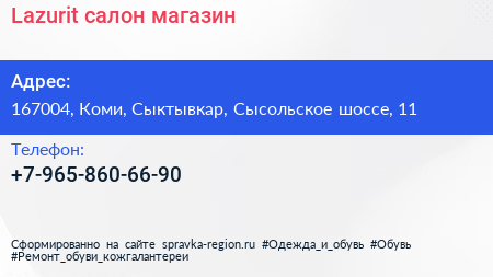 Lazurit, салон-магазин по адресу 167004, Коми, Сыктывкар, Сысольское шоссе, 11 в дальнейшем Организация, размещена в следующих категориях: