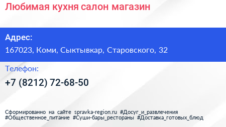 Любимая кухня, салон-магазин по адресу 167023, Коми, Сыктывкар, Старовского, 32 в дальнейшем Организация, размещена в следующих категориях: