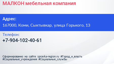 МАЛКОН, мебельная компания по адресу 167000, Коми, Сыктывкар, улица Горького, 13 в дальнейшем Организация, размещена в следующих категориях: