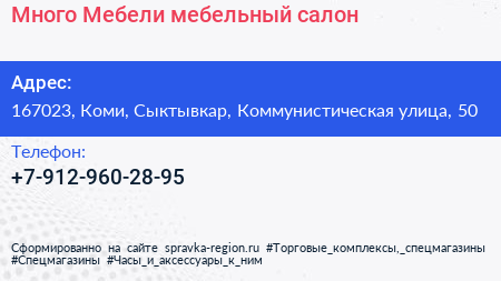 Много Мебели, мебельный салон по адресу 167023, Коми, Сыктывкар, Коммунистическая улица, 50 в дальнейшем Организация, размещена в следующих категориях: