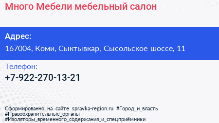 Много Мебели, мебельный салон по адресу 167004, Коми, Сыктывкар, Сысольское шоссе, 11 в дальнейшем Организация, размещена в следующих категориях: