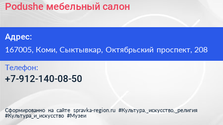 Podushe, мебельный салон по адресу 167005, Коми, Сыктывкар, Октябрьский проспект, 208 в дальнейшем Организация, размещена в следующих категориях:
