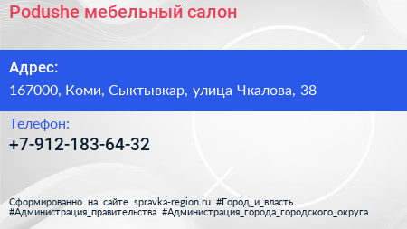 Podushe, мебельный салон по адресу 167000, Коми, Сыктывкар, улица Чкалова, 38 в дальнейшем Организация, размещена в следующих категориях: