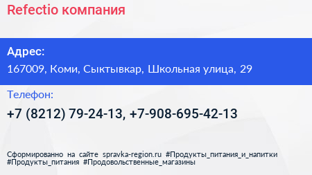 Refectio, компания по адресу 167009, Коми, Сыктывкар, Школьная улица, 29 в дальнейшем Организация, размещена в следующих категориях: