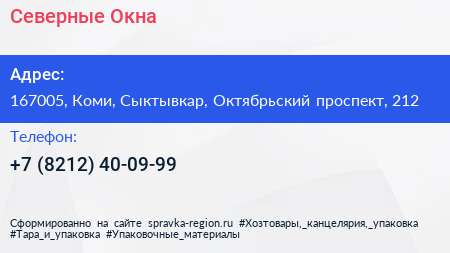 Северные Окна по адресу 167005, Коми, Сыктывкар, Октябрьский проспект, 212 в дальнейшем Организация, размещена в следующих категориях: