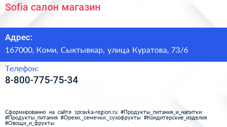 Sofia, салон-магазин по адресу 167000, Коми, Сыктывкар, улица Куратова, 73/6 в дальнейшем Организация, размещена в следующих категориях: